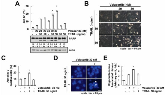 To investigate whether volasertib enhance TRAIL-induced apoptotic cell death, Caki cells were treated with volasertib alone (20, 30 nM), TRAIL alone (30, 50 ng/mL), and with volasertib and TRAIL combined. Apoptotic cell death was assayed via flow cytometry analysis and Western blotting. The combined treatment of volasertib and TRAIL markedly induced an accumulation of apoptotic hypo-diploid sub-G1 phase and cleavage of PARP in a dose-dependent manner (Figure 2A). However, neither volasertib alone nor TRAIL alone induced apoptotic cell death. The combined treatment of volasertib and TRAIL caused apoptotic morphology such as apoptotic body formation, cell shrinkage, and cell detachment on the plate (Figure 2B). Furthermore, the combined treatment of volasertib and TRAIL induced annexin V positive cells (Figure 2C). In addition, we tested nuclear condensation and DNA fragmentation, which is the hallmark of apoptosis. 4′,6′-diamidino-2-phenylindole (DAPI) staining and a cytoplasmic histone-associated DNA fragment assay showed nuclear condensation and DNA fragmentation in the combined treatment of volasertib and TRAIL (Figure 2D,E).