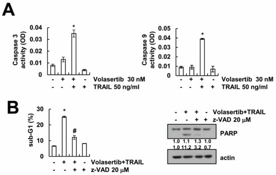 The combined treatment of volasertib and TRAIL induces caspase-mediated apoptosis in Caki cells. (A) Caki cells were treated with 30 nM volasertib plus 50 ng/mL TRAIL for 24 h. Caspase activities was determined with colorimetric assays using caspase-3 DEVDase or caspase-9 LEHDase assay kits. (B) Caki cells were treated with 30 nM volasertib plus 50 ng/mL TRAIL in the presence or absence of 20 μM z-VAD-fmk (z-VAD) for 24 h. The sub-G1 fraction was detected via flow cytometry. The expression of PARP and actin were determined via Western blotting. The values in graphs (A,B) represent the mean ± SD from three independent samples. * p < 0.01 compared to the control. # p < 0.01 compared to volasertib plus TRAIL.