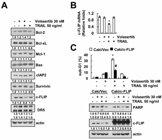 The downregulation of c-FLIP is associated with the induction of combined treatment-induced apoptosis. (A,B) Caki cells were treated with 50 ng/mL TRAIL in the presence or absence of 30 nM volasertib for 24 h. The protein expression levels of Bcl-2, Bcl-xL, Mcl-1, Bax, cIAP2, survivin, c-FLIP, DR5, and actin were determined via Western blotting (A). The mRNA expression levels of c-FLIP and actin were determined by qPCR (B). (C) Cells (Caki/Vec and Caki/c-FLIP) were treated with 50 ng/mL TRAIL in the presence or absence of 30 nM volasertib for 24 h. The sub-G1 fraction was detected via flow cytometry. The protein expression levels of PARP, c-FLIP, and actin were determined via Western blotting. The values in graphs (B,C) represent the mean ± SD from three independent samples. * p < 0.01 compared to the control. # p < 0.01 compared to volasertib plus TRAIL-treated Caki/Vec.