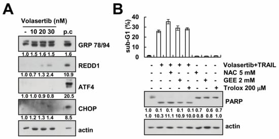 TRAIL sensitization by volasertib is independent of ER stress and ROS signaling pathway. (A) Caki cells were treated with the indicated concentrations of volasertib or 2 μM brefeldin A (P.C; positive control) for 6 h. The protein expression levels of Grp78/94, REDD1, ATF4, CHOP, and actin were determined via Western blotting. (B) Caki cells were pretreated with 5 mM NAC, 2 mM GEE, and 200 μM trolox for 30 min, and then supplemented with 50 ng/mL TRAIL plus 30 nM volasertib for 24 h. The sub-G1 fraction was measured via flow cytometry. The expression of PARP and actin were determined via Western blotting. The values in graph (B) represent the mean ± SD from three independent samples.
