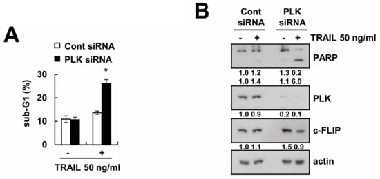 Downregulation of PLK by siRNA sensitizes TRAIL-induced apoptosis in Caki cells. (A,B) Caki cells were transiently transfected with control siRNA (Cont siRNA) or PLK siRNA. After transfection, Caki cells were treated with 50 ng/mL TRAIL for 24 h. The level of apoptosis was analyzed by the sub-G1 population using flow cytometry (A). The protein expression levels of PARP, PLK, c-FLIP, and actin were determined via Western blotting (B). The values in graph (A) represent the mean ± SD from three independent samples. * p < 0.01 compared to TRAIL-treated control siRNA.