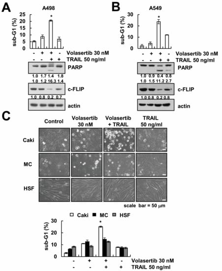 The effects of the combined treatment of volasertib and TRAIL on apoptosis in other carcinoma and normal cells. (A,B) A498 (renal carcinoma) and A549 (lung carcinoma) cells were treated with 50 ng/mL TRAIL in the presence or absence of 30 nM volasertib for 24 h. The level of apoptosis was measured by the sub-G1 fraction using flow cytometry. The protein expression levels of PARP, c-FLIP, and actin were determined via Western blotting. (B) Caki, mesangial cells (MC), and human skin fibroblast (HSF) cells were treated with 50 ng/mL TRAIL in the presence or absence of 30 nM volasertib for 24 h. The cell morphology was examined using interference light microscopy. The level of apoptosis was measured by the sub-G1 fraction using flow cytometry. The values in graphs (A–C) represent the mean ± SD from three independent samples. * p < 0.01 compared to control.