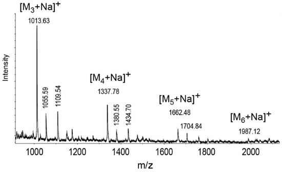Matrix-assisted laser desorption ionization time-of-flight (MALDI-TOF) mass spectrum of the partially hydrolyzed polysaccharide fraction of Plesiomonas shigelloides 78/89 LPS. The MALDI-TOF mass spectrum was obtained in a positive linear mode. 2,5-Dihydroxybenzoic was used as matrix. M3, M4, M5, and M6 represent the mass of the respective number of repeating units.