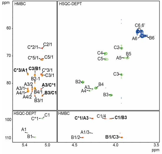 The NOESY and HMBC (Table 2, Figure 3) spectra showed inter-residue cross-peaks between the transglycosidic protons, and between the anomeric protons and carbons at the linkage position as well as carbons and the protons at the linkage position, respectively. The inter-residue NOEs were identified between H-1 of residue A and H-3 of residue C* and between H-1 of residue C* and H-3 of residue A for the O-acetylated RU as well as between H-1 of residue B and H-3 of residue C, and between H-1 of residue C and H-3 of residue B for the non-acetylated form of the repeating unit.