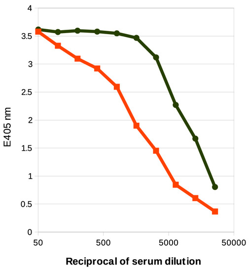 ELISA profiles of polyclonal antibodies specific for the P. shigelloides serotype O12 with LPSs of P. shigelloides 78/89 (black line) and K. pneumoniae Kp20 (red line) as solid-phase antigens (10 μg/mL). The depicted ELISA values are the means of four replicates.