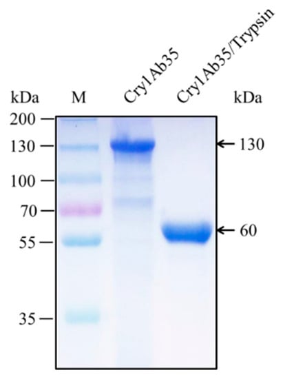Cry1Ab35 was expressed as a 130 kDa protein in B. thuringiensis acrystalliferous mutant HD73− and yielded a 60 kDa fragment upon 1/20 (w/w) trypsin activation (Figure 1). The Cry1Ab35 toxin exhibited high toxicity against H. cunea first instar larvae and the LC50 was 4.34 μg/mL (slope ± SEM, 0.90 ± 0.14; chi-square, 4.25; 95% confidence interval, 1.96–12.27).