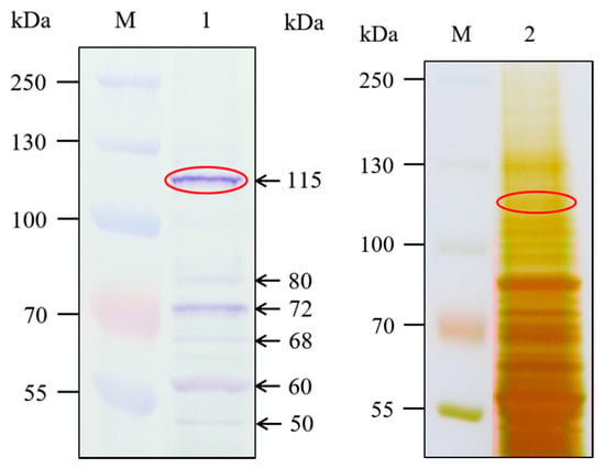 Midguts from different larvae instars (from third to sixth) of H.cunea were dissected, washed in ice-cold MET buffer (300 mM mannitol, 17 mM Tris-HCl, and 5 mM EGTA, pH 7.5), then frozen in liquid nitrogen, and kept at −70 °C until used. BBMV were prepared following the MgCl2 differential precipitation method described by Wolfersberger et al. [36]. The midguts were homogenized in nine volumes of MET with 1 mM PMSF (Biosharp). After adding 24 mM MgCl2 buffer, the homogenate was gently mixed, incubated on ice for 15 min, and then centrifuged at 2500× g for 15 min at 4 °C. The supernatant was transferred to a new centrifuge tube and centrifuged at 30,000× g for 30 min at 4 °C. The pellet was resuspended in half homogenate volume of MET buffer and homogenized again. Incubation with MgCl2 and subsequent centrifugations were repeated as described above. The final pellet was resuspended in half-strengh MET buffer and stored at −70 °C until used. BBMV proteins from the first and second instars of H. cunea were prepared from whole insect bodies following procedures above. The total protein concentration was quantified as described above for toxin. Prepared BBMV samples were loaded on 10% SDS-PAGE for ligand blot assays and protein identification.