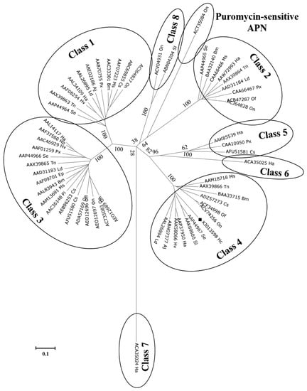 - Hughes, A.L. Evolutionary diversification of aminopeptidase N in Lepidoptera by conserved clade-specific amino acid residues. Mol. Phylogen. Evol. 2014, 76, 127–133. [Google Scholar] [CrossRef] [PubMed]