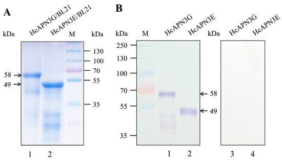 HcAPN3G and HcAPN3E fragment peptides expressed in E.coli BL21 (DE3) cells. HcAPN3G (lane 1) and HcAPN3E (lane 2) peptides expressed in E. coli BL21 (DE3) cells were separated by 10% SDS-PAGE, and either stained with Coomassie Brilliant Blue R-250 (A) or transferred to a PVDF membrane and probed by Cry1Ab35 toxin in ligand blot assay (B) with anti-Cry1Ab35 antibodies. Lane 3 and 4 was HcAPN3G and HcAPN3E control without Cry1Ab35 toxin ligand respectivily. Lane M shows molecular weight markers and arrows indicate the 58 kDa HcAPN3G and 49 kDa HcAPN3E protein bands.