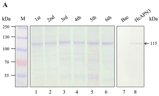 Using the anti-HcAPN3 antibodies, we detected an immunoreactive band of 115 kDa in H. cunea BBMV from different development larval stages (Figure 6A, lane 1–6) as well as in Sf9 cells infected with recombinant baculovirus containing full-length HcAPN3 (Figure 6A, lane 8). The protein was not detected in cells infected with vector alone (Figure 6A, lane 7).