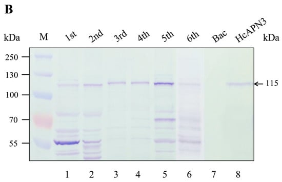 For expression of HcAPN3 in the Spodoptera frugiperda cells (Sf9), transfection was performed in a six-well format with the recombinant bacmids (1–2 mg) and Cellfectin II Reagent (Invitrogen) following manufacturer’s instructions as described by Ning et al. [40]. When the signs of infection were visually respected, Sf9 cells were collected for PCR analysis and the culture supernatants were harvested as P1 viral stock. Subsequently, the recombinant baculovirus were amplified by infection of Sf9 cells at a multiplicity of infection (MOI) of 0.05–0.1. When infection resulted in 70–80% cell mortality, the supernatants were collected as P2 viral stock. For protein expression, Sf9 cells were infected by P2 viral stock using an MOI 1–5. The infected cells were harvested at different time intervals (24, 48, 72, and 96 h) post-infection to assay for protein expression by 10% SDS-PAGE and Western blot. Transfection with the bacmid derived from pFastBac HT vector was performed as a negative control.