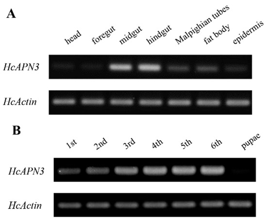 The spatiotemporal expression profiles of HcAPN3 in different larval tissues and developmental stages were analyzed by the semi-quantitative PCR. Tissue-specific expression analysis revealed that HcAPN3 was highly abundant in the midgut and hindgut, when compared with the Malpighian tubules and fat body tissues. However, it decreased to a very low expression level in the foregut, head and epider tissues (Figure 7A). Developmental expression results showed that HcAPN3 was expressed throughout the entire larval cycle and highly expressed in the third, fourth, fifth, and sixth instars. In contrast, it was scarcely detected in pupae (Figure 7B).