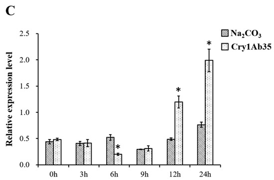 The expression pattern of HcAPN3 induced by dietary Cry1Ab35 toxin was investigated by qPCR. The result revealed that the gene was down-regulated at 6 h (p < 0.05, SNK test), then was up-regulated significantly at 12 and 24 h time points after Cry1Ab35 treatment (p < 0.05, SNK test) (Figure 7C).