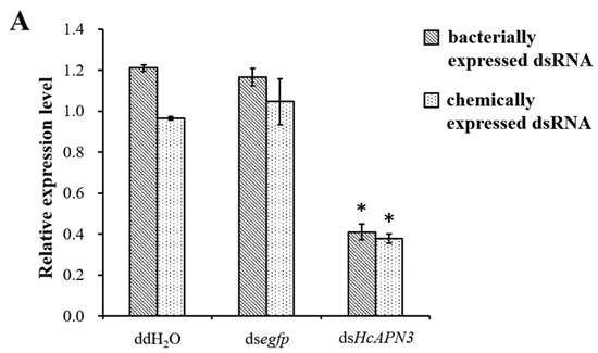 Preparation of bacterially expressed dsRNA. A 482 bp internal fragment of HcAPN3 gene and a 420 bp fragment of the enhanced green fluorescent protein (egfp) gene (control) were obtained by PCR using the corresponding specific primers indicated in Table S1. The amplified fragments were cloned into pL4440 vector and subsequently transformed into E. coli HT115 (DE3) cells lacking RNase III to produce double-strand RNA (dsRNA). Cells were induced to express dsRNA by addition of 0.4 mM IPTG and incubated for 4 h at 37 °C with agitation. The total RNA of bacterial cells were extracted with RNAprep pure Cell/Bacteria Kit (Tiangen) to confirm dsRNA expression by electrophoresis on a 1% agarose gel. A large scale of bacterial cells were centrifuged at 5000× g for 10 min, resuspended in ddH2O at the ratio of 20:1 (20× concentration, the concentration of expressed dsRNA was approximately 0.5 μg/μL), and then used for bioassay.