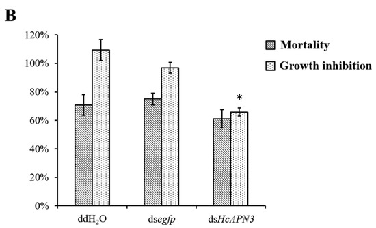 Bacterially expressed dsRNA targeting HcAPN3 were dietarily introduced into H. cunea first instar larvae. After continuous ingestion of dsRNA for 4 days, the transcript level of HcAPN3 in larvae was reduced by approximately 66%, which was significantly lower compared to that in the larvae feeding on double-distilled water (ddH2O) or egfp dsRNA-overlaid diet (p < 0.05, SNK test) (Figure 8A). We did not detect significant differences in Cry1Ab35-induced mortality in HcAPN3 dsRNA-treated larvae in comparison with control larvae (Figure 8B). In comparison, when chemically synthesized dsRNA were injected into H. cunea third instars to silence HcAPN3 expression, a significant reduction of HcAPN3 transcript of approximately 61% was observed 3 days after injection (p < 0.05, SNK test) (Figure 8A). We were unable to detect significant differences in Cry1Ab-induced mortality compared to control larvae. However, we did detect a lower percentage of larval growth inhibition after 4 days in HcAPN3-silenced larvae compared to control (Figure 8B).