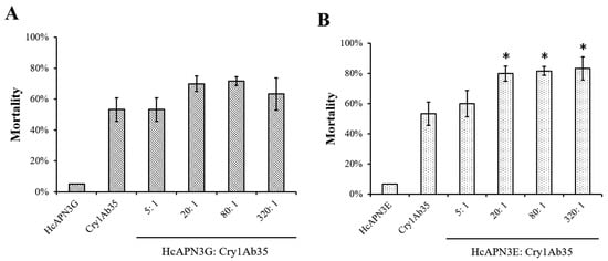 Enhancement of HcAPN3G and HcAPN3E fragment peptides to the toxicity of Cry1Ab35 toward 3 days first instars of H. cunea in diet overlay bioassays. Purified HcAPN3G (A) or HcAPN3E (B) peptide were mixed with Cry1Ab35 toxin at peptide:toxin mass ratios of 5:1, 20:1, 80:1, and 320:1. Control treatments included HcAPN3G or HcAPN3E peptide and Cry1Ab35 toxin alone. Each column presents data for the mean ± SEM from three replicate bioassays. An asterisk above the column indicates that the mortality of Cry1Ab35 plus fragment peptide treatment showed significant difference from Cry1Ab35 alone treatment (SNK test, p < 0.05).