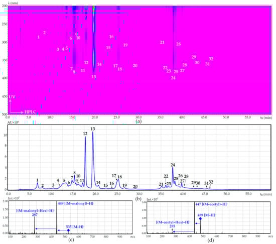 HPLC-UV map (a); and RP-HPLC-DAD chromatogram at 280 nm (b) of low-temperature sample of D. palmatum herb; ESI-MS spectra of unknown compounds 6 (eriodictyol-O-malonyl-hexoside) and 20 (luteolin-O-acetyl-hexoside) presented at (c,d), respectively. The numbers in the Figure 1a,b correspond to the compounds indicated in Table 4. AU, absorbance units; Int., signal intensity.