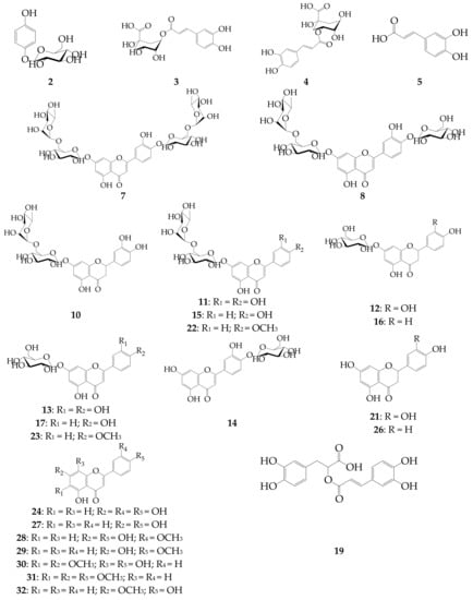 Structures of phenolic compounds 2–5, 7, 8, 10–17, 19, 21–24, and 26–32 detected in D. palmatum herb.