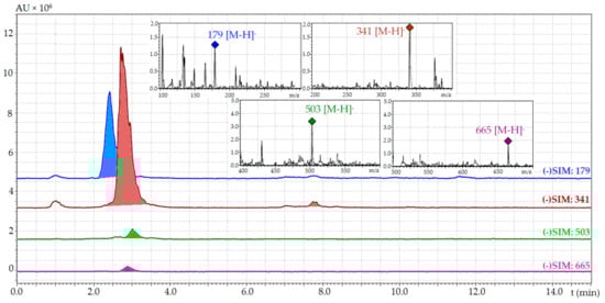 RP-HPLC-MS chromatograms in selected ion monitoring mode (SIM, negative ionization) of free sugars fraction of D. palmatum herb (low-temperature sample). SIM with following m/z value used: 179 for glucose, 341 for sucrose, 503 for raffinose, 665 for stachyose. On cuts, mass spectra of corresponding compounds; AU, absorbance units.