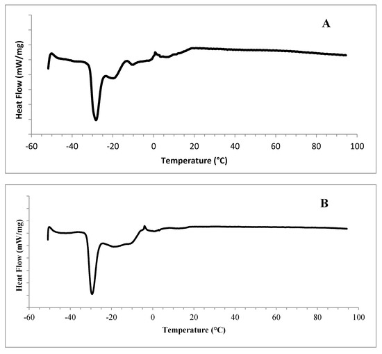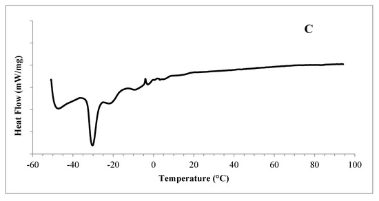 A distinct sharp narrow peak occurred at −29.02, −29.86 and −30.92 °C for the Zaghouan, Sousse and Bizerte seed oils, respectively. Beyond this typical and distinguishable peak, other endothermic transitions occurred, too. In fact, the Zaghouan Silybum marianum L. seed oil showed four transitions that occurred at −20.51, −11.91, −3.06 and 4.57 °C. Furthermore, The Sousse seed oil exhibited four shoulder merging peaks, which occurred, respectively, at −20.63, −11.57, −0.4 and 11.36 °C. However, the Bizerte seed oil showed five endothermic transitions that occurred at −22.92, −11.63, −3.3, 2.89 and 11.62 °C. All of the endothermic transitions, occurred beyond the typical one, illustrated approximately the same temperature range (the range of the transitions can be calculated as temperature difference between Ton and Toff). The last transitions could be associated with the melting of the highest stability polymorphic forms of TAG, mainly monosaturated triacylglycerols (MSTAG). Yet, the disaturated triacylglycerols (DSTAG) could not be excluded. Nyam et al. [21] reported that vegetable oils with high content of saturated fatty acids (SFA) experienced DSC melting profiles at higher regions as compared to oils with a high content of unsaturated fatty acids (UFA). The complex endothermic events occurring at higher temperatures were attributed to the melting of crystallized lipids and were characterized by multiple overlapping contributions as previously observed in vegetable [33,34] and olive oils [34,35,36]. No endothermic phenomenon was illustrated beyond 12 °C. Such a feature may confirm the liquid state of the Silybum marianum L. seed oils at room temperature (25 °C), and consequently the absence of crystals.