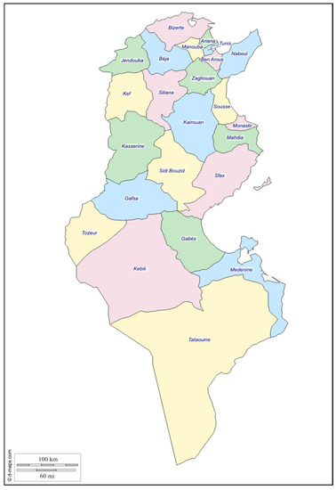 Map of Tunisia indicating the regions where milk thistle seed samples were gathered.