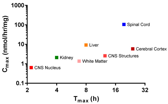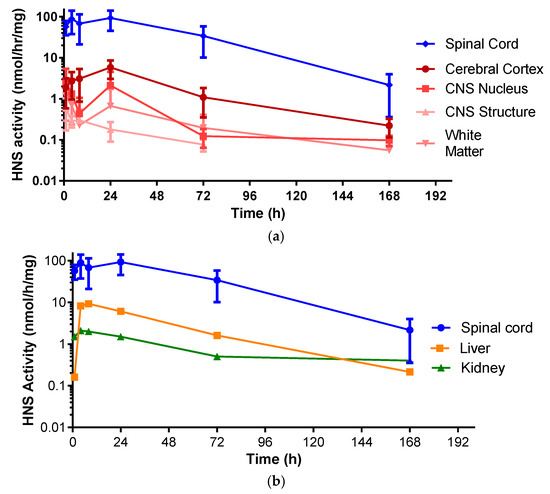 In animals who received IT rhHNS 14.5 mg, the peripheral organs, kidney, and liver had similar enzyme activity profiles, but liver exposure was four times greater than kidney exposure (Cmax 9.2 vs. 2.1 nmol/h/mg protein, respectively). In both peripheral organs, HNS was first observed within 1 h post dose and was still observed at 7 days (Figure 3b). The relative peak exposures and times of HNS in sampled tissues after IT administration are shown in Figure 4.