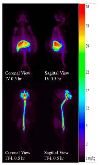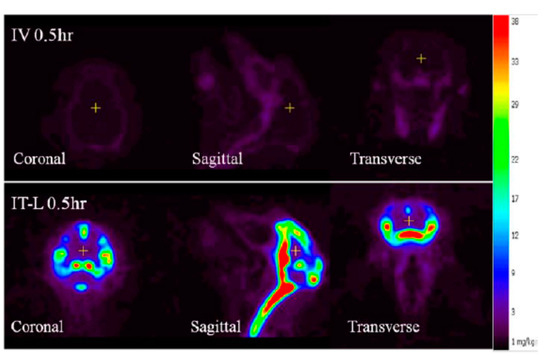 Positron emission tomography (PET) imaged biodistribution profiles of rhHNS 0.5 h following administration of intravenous (IV) rhHNS 1.0 mg/kg and intrathecal (IT) rhHNS 3.0 mg.