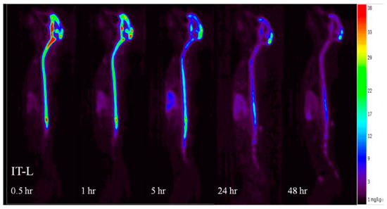 Whole-body positron emission tomography (PET) biodistribution kinetic images of rhHNS 0.5–48 h after administration of IT rhHNS 3.0 mg.