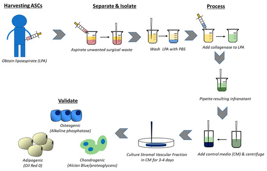 Schematic showing the processes and procedures for collection, isolation, and validation of adipose-derived mesenchymal stem cells (ASCs). The lipoaspirate (LPA) is frequently obtained from subcutaneous adipose tissue of the abdomen or thigh, and the miRNA expression pattern may differ among various adipose depots. Samples are washed and processed with collagenase to obtain a stromal vascular fracture that can be induced along osteogenic, adipogenic, or chondrogenic pathways.