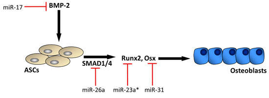 The BMP-2 signaling pathway plays an important role in the osteogenic differentiation of adipose-derived stem cells (ASCs). BMP-2 signaling induces downstream effectors SMAD 1 and SMAD 4, which in turn activate the key osteogenic transcription factors Runx2 and Osterix (Osx). Several miRNAs are expressed during this process that can attenuate this osteogenic pathway at various steps (red bars). * miR-23a interacts with Runx2, but there are numerous miRNAs targeting Runx2 in addition to miR-23a (Refs. [54,55]).