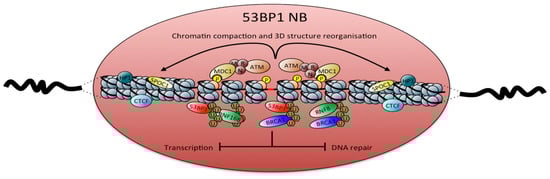 Finally, local changes in chromatin structure seem to be associated to 53BP1 NBs. This is exemplified by the accumulation to such domains of CTCF (CCCTC-binding factor), an insulator protein that establishes functional three-dimensional chromatin structures [49]. Factors influencing chromatin compaction are also present at 53BP1 NBs. These include SPOC1, which modulates the association of many heterochromatin-building factors as HP1 (heterochromatin protein 1), also present at 53BP1 NBs [50,51]. On the other hand, 5-hydroxymethylcytosine (5hmC), a modified DNA base associated to open chromatin structure, also localizes at these NBs [52]. According to the drastic changes in chromatin configuration at DNA damage sites [53] or to growing body of evidences of 5hmC roles in DNA repair [54], modification of chromatin structure at 53BP1 NBs should be a consequence of DDR activation. However, while 5hmC accumulation signals an open chromatin state necessary for efficient DNA repair, SPOC1-mediated chromatin compaction has been correlated to NHEJ repression [51]. Therefore, 53BP1 NBs integrity should require an open chromatin environment to efficiently signal DNA damage. At the same time, transcription is tightly regulated and DNA repair may be inhibited, or more probably just delayed until a more favorable cellular context (Figure 1).