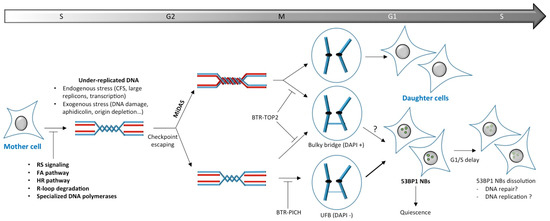 DNA ultra-fine bridges (UFBs) arise when a cell enters anaphase without having resolved late replication intermediates through MiDAS. UFBs are labeled by FANCD2/FANCI proteins at their extremities [98,99,107] and the persistence of FANCD2 foci from S/G2 phases to anaphase structures supports that these bridges originate from under-replicated regions. Actually a subclass of UFBs comes from CFS loci and is often γH2AX positive. UFBs constitute the last opportunity to ensure proper sister-chromatid disjunction. The PICH (PLK1-interacting checkpoint helicase) DNA translocase associates along UFBs to prevent DNA bridges and contribute to RIF1 and BLM helicase recruitment that, in concert with Topoisomerase II activity, resolve these bridges during anaphase by decatenation [108]. Thereby, as a consequence of incomplete resolution of these DNA structures, downregulation of BLM, PICH or RIF1 enhances 53BP1 NBs formation in G1 daughter cells. Interestingly, delaying UFB resolution by using topoisomerase 2 inhibitor is sufficient per se to enhance 53BP1 NBs formation, independently of any apparent DNA replication defects [108]. This suggests impairing the faithful resolution of catenated DNA molecules or late replication intermediates in anaphase could give rise to DNA lesions sequestered in 53BP NBs. Therefore, UFB resolution constitutes the last chance for rescuing partially replicated stretches of DNA before the end of anaphase, ensuring genomic stability (Figure 2).