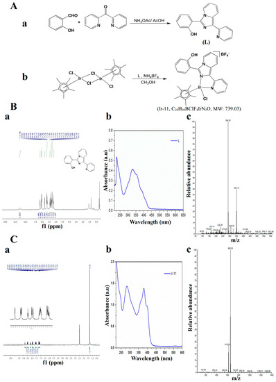 Chemical synthesis of Ir-11 compound. (A) Synthesis of (a) ligand (L) and (b) the complex [Ir(Cp*)(L)Cl]BF4 (Ir-11); (B) Spectral image of ligand 2-(1-pyridin-2-yl-imidazo[1,5-a]pyridin-3-yl)-phenol (a) nuclear magnetic resonance (NMR) (b) UV–vis absorption and (c) electrospray ionization mass spectrometry (ESI-MS); (C) Spectral image of Ir-11complex (a) NMR (b) UV–vis absorption and (c) ESI-MS.