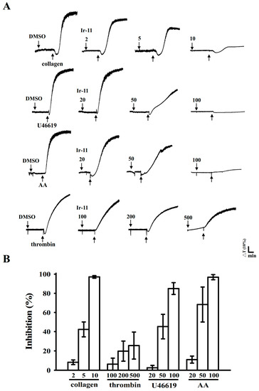 Ir-11 (2–10 µM; Figure 2) strongly inhibited aggregation of collagen-stimulated (1 µg/mL) human platelets in a concentration-dependent manner. Furthermore, Ir-11 (20–100 µM) exhibited moderate activity against stimulation by arachidonic acid (AA, 120 µM) or U46619 (1 µM), a prostaglandin endoperoxide; however, Ir-11 (100–500 µM) exhibited relatively low inhibition of platelet aggregation that was stimulated using thrombin (0.01 U/mL) (Figure 2). The 50% inhibitory concentration (IC50) of Ir-11 for collagen-stimulated aggregation was approximately 6 µM. Therefore, in the subsequent experiments, the IC50 (6 µM) and maximal concentration (10 µM) of Ir-11 were used for exploring the possible mechanisms of action of Ir-11 on human platelets. In addition, the solvent control (0.1% dimethyl sulfoxide, DMSO) did not significantly affect platelet aggregation (Figure 2A).