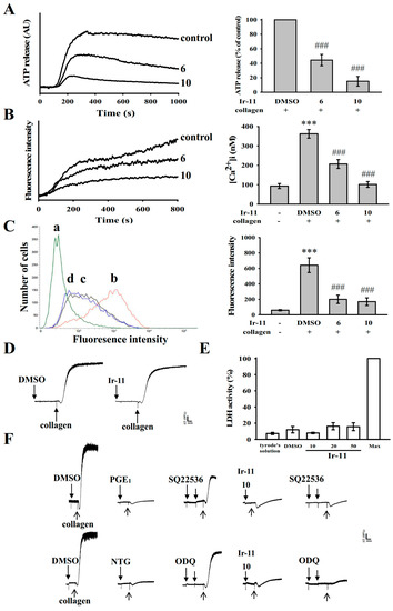 This study was approved by the Institutional Review Board of Taipei Medical University (TMU-JIRB-N201612050, 20 January 2017), and it conformed to the directives of the Declaration of Helsinki. All human volunteers involved in this study provided informed consent. Human platelet suspensions were prepared as described previously [34]. Blood samples were collected from adult human volunteers who had not taken any drugs or other substances for at least 14 days before collection; the collected blood samples were mixed with an acid–citrate–dextrose solution. After centrifugation, platelet-rich plasma (PRP) was mixed with 0.5 μM PGE1 and 6.4 IU/mL heparin. Tyrode solution comprising 3.5 mg/mL BSA was used to prepare the final suspension of washed human platelets. The final Ca2+ concentration in the Tyrode solution was 1 mM. A platelet aggregation study was conducted using a lumiaggregometer (Payton Associates, Scarborough, ON, Canada), as described previously [33]. An isovolumetric solvent control (0.1% DMSO) or Ir-11 was preincubated with platelet suspensions (3.6 × 108 cells/mL) for 3 min before the addition of agonists (i.e., collagen). The extent of platelet aggregation was calculated as the percentage compared with individual control (without Ir-11) expressed in light transmission units, after the reaction proceeded for 6 min. For an ATP release assay, 20 µL of luciferin–luciferase was added 1 min before the addition of the collagen (1 µg/mL), and the amount of ATP released was compared with that released by the control (without Ir-11).