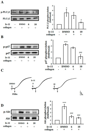 Inhibitory effects of Ir-11 on PLCγ2, PKC, and Akt activation in platelets. Washed platelets were preincubated with the solvent control (0.1% DMSO) or Ir-11 (6 and 10 µM), and subsequently treated with collagen (1 µg/mL) or PDBu (150 nM) to induce (A) PLCγ2 and (B) PKC activation (p47, pleckstrin phosphorylation), (C) platelet aggregation, and (D) Akt phosphorylation. Platelets were collected, and their subcellular extracts were analyzed to determine the levels of protein phosphorylation. Data are presented as means ± standard error of the means (n = 4). * p < 0.05 and *** p < 0.001, compared with the resting control; # p < 0.05 and ### p < 0.001, compared with the DMSO-treated group. The profiles in (C) are representative of four independent experiments.
