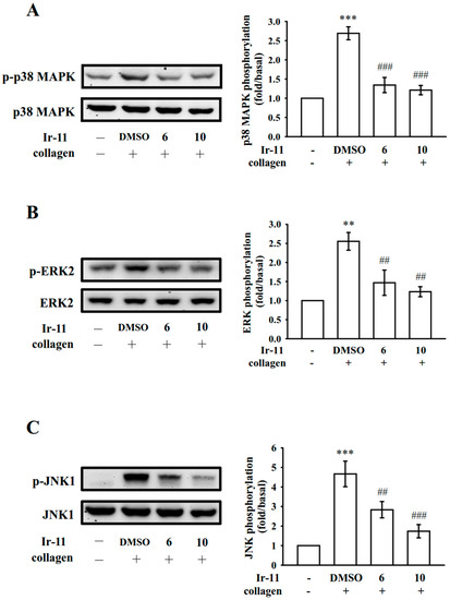 Effects of Ir-11 on p38 MAPK, ERK2, and JNK1 phosphorylation in collagen-activated platelets. Washed platelets were preincubated with the solvent control (0.1% DMSO) or Ir-11 (6 and 10 µM) and subsequently treated with collagen (1 µg/mL) to trigger (A) p38 MAPK, (B) ERK2, and (C) JNK1 activation. Platelets were collected, and their subcellular extracts were analyzed to determine the levels of protein phosphorylation. Data are presented as means ± standard error of the means (n = 4). ** p < 0.01 and *** p < 0.001, compared with the resting control; ## p < 0.01 and ### p < 0.001, compared with the DMSO-treated group.