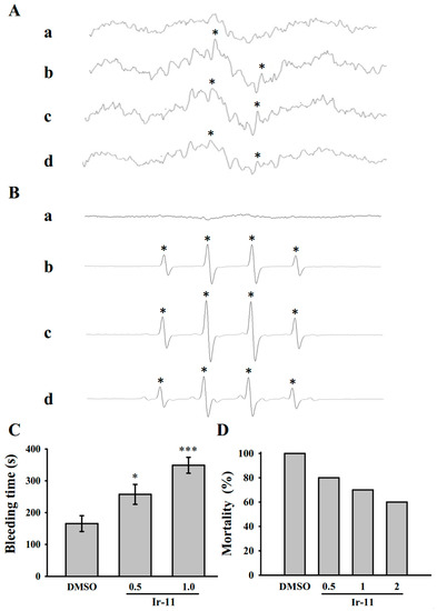 Regulatory activities of Ir-11 on OH· formation in platelet suspensions or the Fenton reaction solution, and bleeding time in the tail vein as well as acute pulmonary thromboembolism in experimental mice. (A) Washed platelets or (B) the Fenton reaction solution was preincubated with Tyrode solution (a, resting control), (b) 0.1% DMSO, or Ir-11 at (c) 6 µM or (d) 10 µM. Collagen (1 µg/mL) was then added for the ESR experiments as described in Materials and Methods. Profiles are representative of four independent experiments, and an asterisk (*) indicates OH· formation; (C) The bleeding time was measured through transection of the mouse tail after 30 min of administering either 0.1% DMSO, 0.5 mg/kg, or 1.0 mg/kg Ir-11 intraperitoneally (all in 50 µL); (D) For acute pulmonary thrombosis study, 0.1% DMSO or Ir-11 in various doses (0.5, 1, and 2 mg/kg) (all in 50 µL) was administered intraperitoneally to the mice, and ADP (0.7 mg/g) was then injected through the tail vein. Data are presented as means ± standard error of the means (C, n = 8; D, n = 10). * p < 0.05 and *** p < 0.001, compared with the DMSO (0.1%)-treated group.