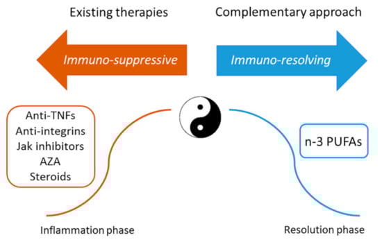 Scaioli, E.; Liverani, E.; Belluzzi, A. The Imbalance between n-6/n-3 Polyunsaturated Fatty Acids and Inflammatory Bowel Disease: A Comprehensive Review and Future Therapeutic Perspectives. Int. J. Mol. Sci. 2017, 18, 2619. https://doi.org/10.3390/ijms18122619