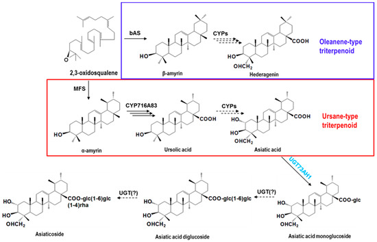 To date, 33 oleanane- and ursane-type saponins have been reported in C. asiatica [26], all of them containing a glucose linked to the triterpene C-28 carboxyl, whereas no glucose linked with C-2α, C-3β, and C-23 positions has been observed. Therefore, it seems very likely that UGT73AH1 catalyzes glycosylation at the C-28 carboxyl function en route to the asiaticoside triterpene saponins.