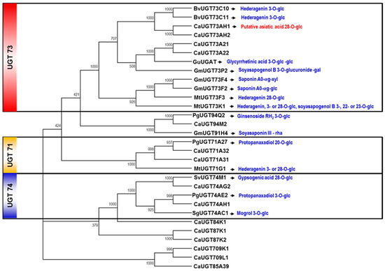 Phylogenetic analysis of UGTs from C. asiatica and other plant species. Sequences of UGTs associated with triterpene saponin biosynthesis were retrieved from the NCBI database: MtUGT71G1 (AAW56092), PgUGT71A27 (KM491309), BvUGT73C10 (AFN26666), BvUGT73C11 (AFN26667), MtUGT73K1 (AAW56091), MtUGT73F3 (ACT34898), GmUGT73F2 (BAM29362), GmUGT73F4 (29363), GmUGT73P2 (BAI99584), GuUGAT (KT759000), SvUGT74M1 (ABK76266), PgUGT74AE2 (JX898529), SvUGT91H4 (BAI99585), and PgUGT94Q2 (JX898530).