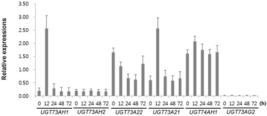 MeJA is known to strongly stimulate expression of C. asiatica genes encoding enzymes along the biosynthetic pathway from farnesyl diphosphate to triterpene glycosides. We therefore hypothesized that UGTs involved in asiaticoside and/or madecassoside formation should also be relatively highly expressed upon MeJA induction. Hence, in order to select strong candidates of UGT, we used qRT-PCR to compare the expression levels of the six UGT candidate genes in C. asiatica hairy root cultures elicited by 0.1 mM MeJA for 24 h (Figure 3). Transcripts of four UGT genes, UGT73AH1, UGT73A21, UGT73A22, and UGT74AH1, were upregulated after 12 h of MeJA treatment. In contrast, no significant differences were detected in the expression of the UGT73AH2 gene in response to MeJA treatment, and transcripts of UGT74AG2 could be detected neither in control nor in treated hairy roots. Overall, our qRT-PCR results indicated that four genes, UGT73AH1, UGT73A21, UGT73A22, and UGT74AH1, might be involved in asiaticoside biosynthesis.