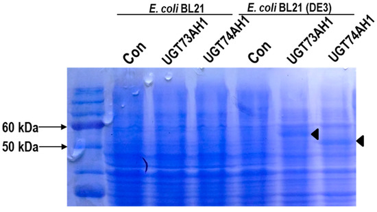 SDS-PAGE analysis of UGT73AH1 and UGT74AH1 heterologously expressed in Escherichia coli. Expression of the proteins in E. coli BL21 and BL21 (DE3) was induced by IPTG for 16 h at 20 °C.