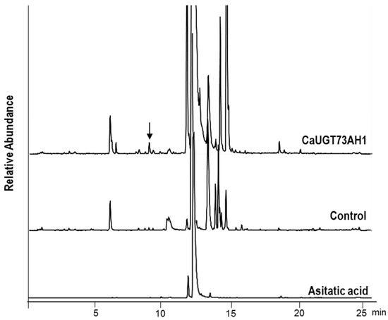 Single colonies of BL21 (DE3) cells harboring the pET-UGT73AH1 or pET-UGT74AH1 vectors were cultured at 37 °C in liquid lysogeny broth (LB) medium containing 50 µg/mL ampicillin to an optical density of 0.5 at 600 nm. Then, the cultures were shifted to 28 °C, and isopropyl thio-β-d-galactoside (IPTG) was added to a final concentration of 0.5 mM, and incubation was continued at 20 °C for 16 h. Finally, cells were collected by centrifugation at 15,000× g for 5 min, suspended in extraction buffer (50 mM sodium phosphate, pH 7.4, 300 mM sodium chloride, 20% glycerol), and then disrupted by sonication for three times 10 s. After cell debris was removed by centrifugation at 15,000× g, the supernatant was checked for the presence of the expressed protein using 10% SDS-PAGE. The total protein extract was used for in vitro assays, performed by incubating 1 mg protein in 1.5 mL 50 mM Tris-HCl, pH 8.5, containing 5 mM uridine-5′-diphosphoglucose and 0.5 mM asiatic acid, at 35 °C for 4 h. Finally, 1.5 mL butanol was added to stop the reaction and extract products, and the organic layer was collected, and the solvent evaporated under nitrogen gas. The resulting residue was re-dissolved in 200 µL of methanol, and stored at 4 °C for chemical analysis.