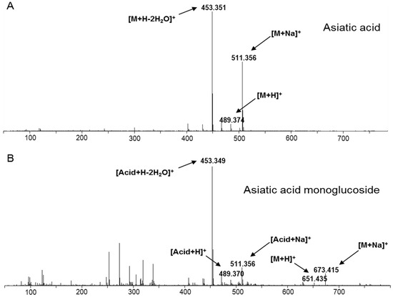 UPLC-QTOF/MS analysis of the products from glycosylation assays of UGT73AH1. (A) Mass spectrum of asiatic acid standard; (B) Mass spectrum of the unique compound formed from enzymatic reaction with UGT73AH1 protein. The fragments m/z 453, 489, and 511, identical to those of the standard, identify this compound as an asiatic acid derivative. The additional fragments m/z 651 and 673 further characterize it as a mono-glycoside.