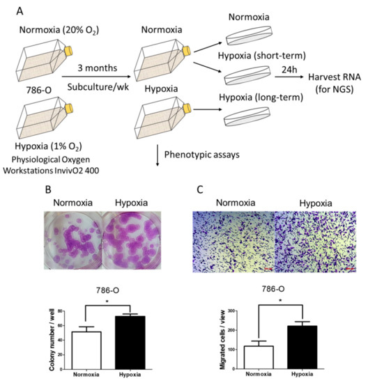 Long-term effects of hypoxia promoted colony formation ability and transwell migration ability in 786-O. (A) 786-O cells with the same number of passages were grown in normoxic and hypoxic conditions for 3 months. The normoxic conditions were 37 °C, 20% O2 and 5% CO2 and the hypoxic conditions were 37 °C, 1% O2 and 5% CO2. The long-term hypoxia-incubated 786-O cells were maintained in a physiological oxygen workstations InvivO2 400 system. The cells were passaged once per week. Short-term hypoxia was performed with 24-h incubation. Total RNA lysates of the 786-O cells with the same number of passages under normoxia, short-term hypoxia and long-term hypoxia were harvested for next-generation sequencing (NGS); Colony forming ability (B) and transwell migration ability (C) were analyzed in the 786-O cells (with the same number of passages) maintained in either normoxic or hypoxic conditions for at least 3 months. (Scale bar = 100 μm) Each experiment was repeated at least three times. (p-values were calculated using the unpaired t-test, * p-value < 0.05).