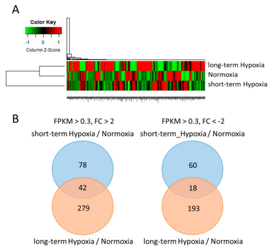 Analysis of protein-coding mRNA profiles using next-generation sequencing in 786-O cells under short- and long-term hypoxia. (A) A hierarchical clustering heat map showed the differentially expressed mRNAs in the 786-O cells that underwent normoxia, short-term hypoxia and long-term hypoxia. Scale = column Zscore (fragments per kilobase of transcript per million mapped reads, FPKM). The red and green colors represent higher and lower expression levels, respectively; (B) Venn diagram analysis showed 279 upregulated genes and 193 downregulated genes in 786-O cells that underwent long-term hypoxia compared to normoxia and 78 upregulated genes and 60 downregulated genes in 786-O cells that underwent short-term hypoxia compared to normoxia. There were 42 upregulated genes and 18 downregulated genes in both short- and long-term hypoxia. The criteria were a |fold change (FC)| >2 (short- or long-term hypoxia/normoxia) and fragments per kilobase of transcript per million mapped reads (FPKM) >0.3.