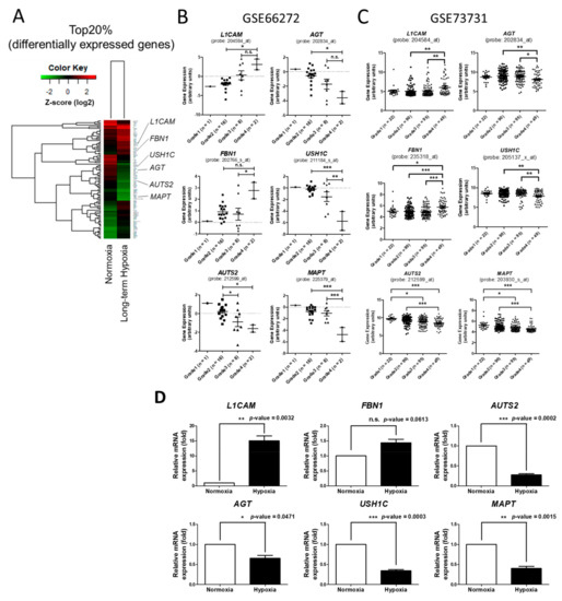 Analysis of the gene expression in clinical ccRCC samples with different malignant grades. (A) A hierarchical clustering heat map showing the top 20% of ranked genes in the 786-O cells with long-term hypoxia compared to normoxia; (B,C) The correlation of gene expression and ccRCC tumor grade was analyzed using microarrays (GSE66272 and GSE73731) data from the Gene Expression Omnibus (GEO) database. GSE66272 provides information of 27 clinical ccRCC samples (grade 1, n = 1; grade 2, n = 16; grade 3, n = 8; and grade 4, n = 2). GSE73731 provides information of 256 clinical ccRCC samples (grade 1, n = 22; grade 2, n = 90; grade 3, n = 95; and grade 4, n = 49); (D) qRT-PCR analysis of gene expression in 786-O cells treated with normoxia and long-term hypoxia. GAPDH was used as internal control. The raw data of GEO microarray datasets were obtained using the GEO2R online tool (Available online: https://www.ncbi.nlm.nih.gov/geo/geo2r/; accessed on 08 August 2017 and 23 November 2017) and re-plotted. (p-values of GEO microarray data were calculated using one-way ANOVA, qRT-PCR data were calculated using paired t-test, *** p-value < 0.001, ** p-value < 0.01, * p-value < 0.05 and n.s. = no significance).