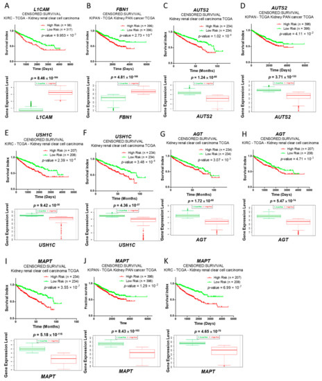 Correlation analysis of gene expressions and survival outcomes in renal cancer. The associations between survival outcomes and gene expressions of L1CAM (A); FBN1 (B); AUTS2 (C,D); USH1C (E,F); AGT (G,H); and MAPT (I–K) were analyzed using the SurvExpress database. TCGA-kidney cancer datasets were used for analysis. Red and green lines represent high- and low-risk groups, respectively. The box plot shows each gene expression in two groups (high and low risk).