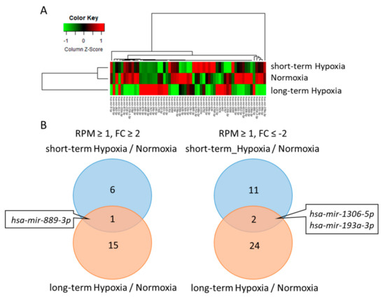 Analysis of microRNA profiles in 786-O with short- and long-term hypoxia compared to normoxia using next-generation sequencing. (A) A hierarchical clustering heat map showing the differentially expressed microRNAs in 786-O cells that underwent normoxia, short-term hypoxia and long-term hypoxia. Scale = column Z-score (reads per million, RPM). The red and green colors represent higher and lower expression levels, respectively; (B) Venn diagram analysis showed 15 upregulated genes and 24 downregulated genes in the 786-O cells undergoing long-term hypoxia compared to normoxia and 6 upregulated genes and 11 downregulated genes in 786-O cells undergoing short-term hypoxia compared to normoxia. There were 1 upregulated gene and 2 downregulated genes in both short- and long-term hypoxia. The criteria were a |fold change| ≥2 (short- or long-term hypoxia/normoxia) and reads per million (RPM) >1.